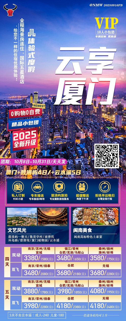 【云享廈門:廈門鼓浪嶼+云水謠+植物園4-5日游 0購(gòu)物0自費(fèi)】.行程
